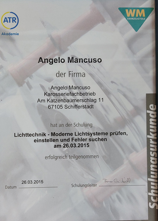 Angelo Mancuso ist gelernter Karosseriebaumeister, der seine Fertigkeiten 1993 mit seiner Ausbildung zum Maler und Fahrzeuglackierer erweiterte. 1998 erhielt er seinen Meisterbrief und eröffnete seine erste eigene Werkstatt. Seitdem ist er mit Leidenschaft für seine Kunden da. 2006 bezog die Autolackiererei Mancuso das neue Firmengelände im Katzenbaumerschlag und ist seither der einzige Karosseriebauer in Schifferstadt.